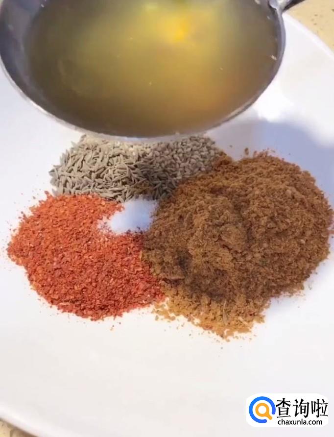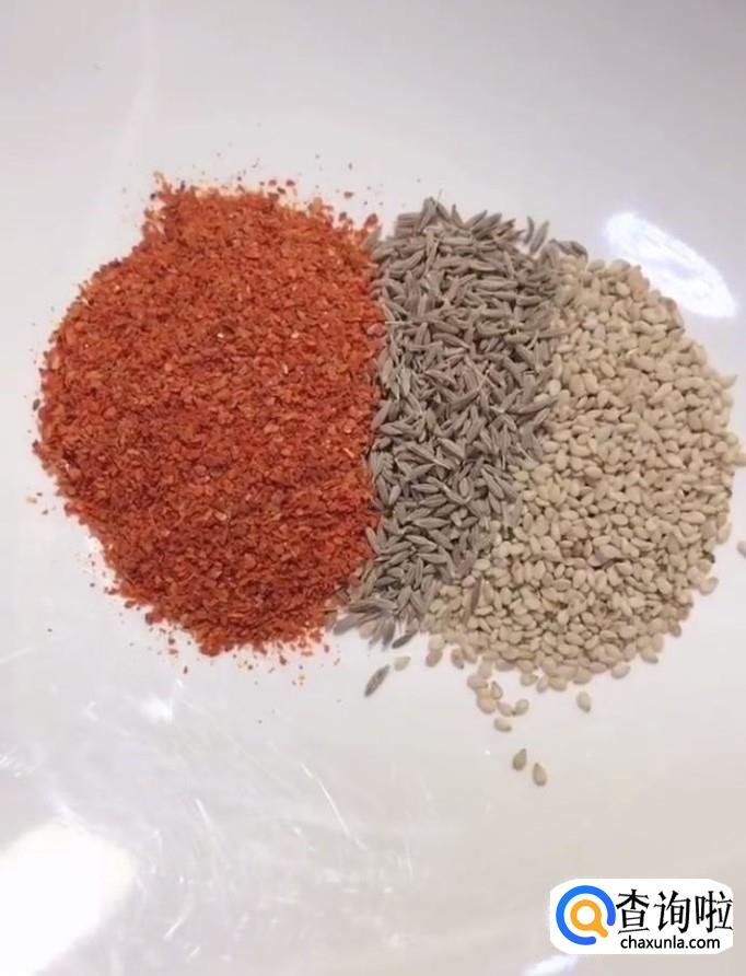 然后我们准备一下料:在盘中放入芝麻,孜然粉,辣椒面,烧烤料,适量的盐