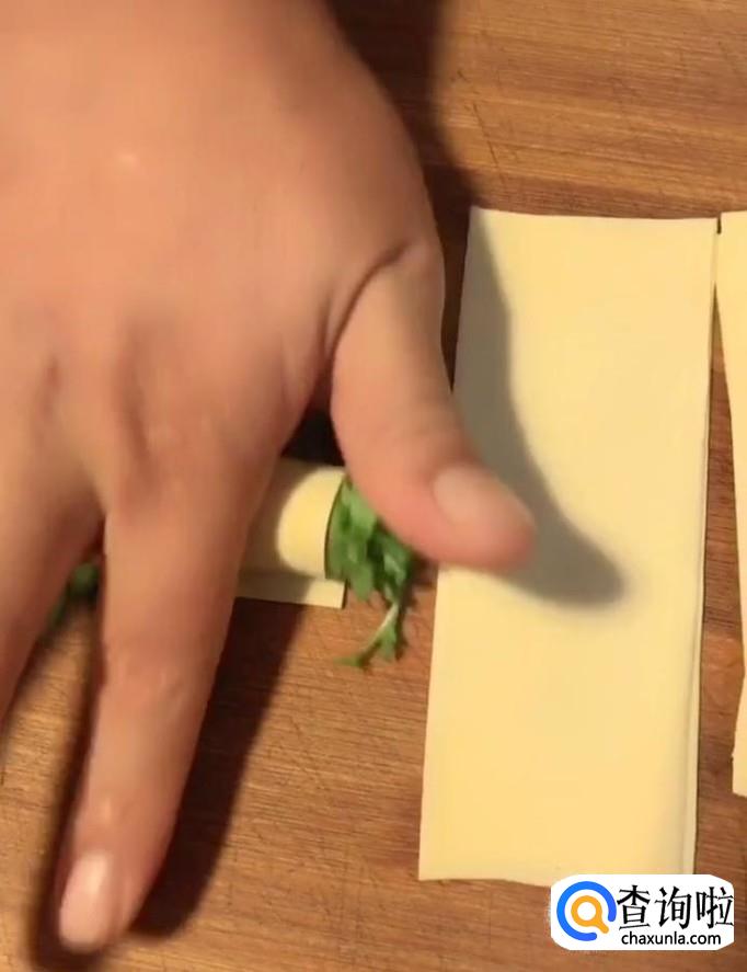 首先我们将豆腐皮切成条,把青菜卷起来