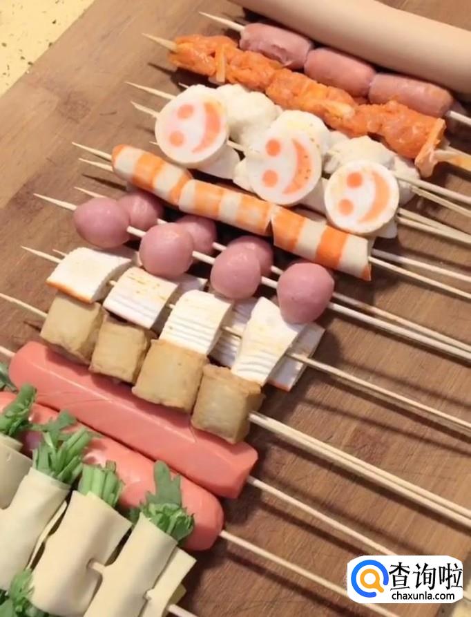 然后我们准备一些自己爱吃的麻辣烫与火腿肠分别用竹签串起来备用