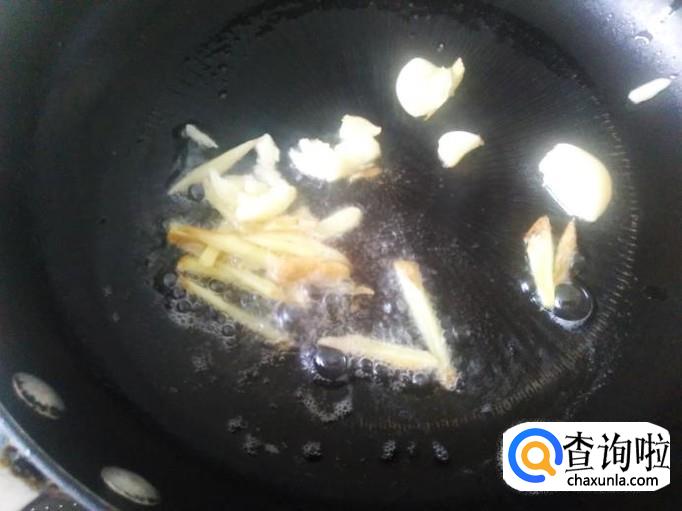 开火下油,放蒜米、姜丝进去爆香。