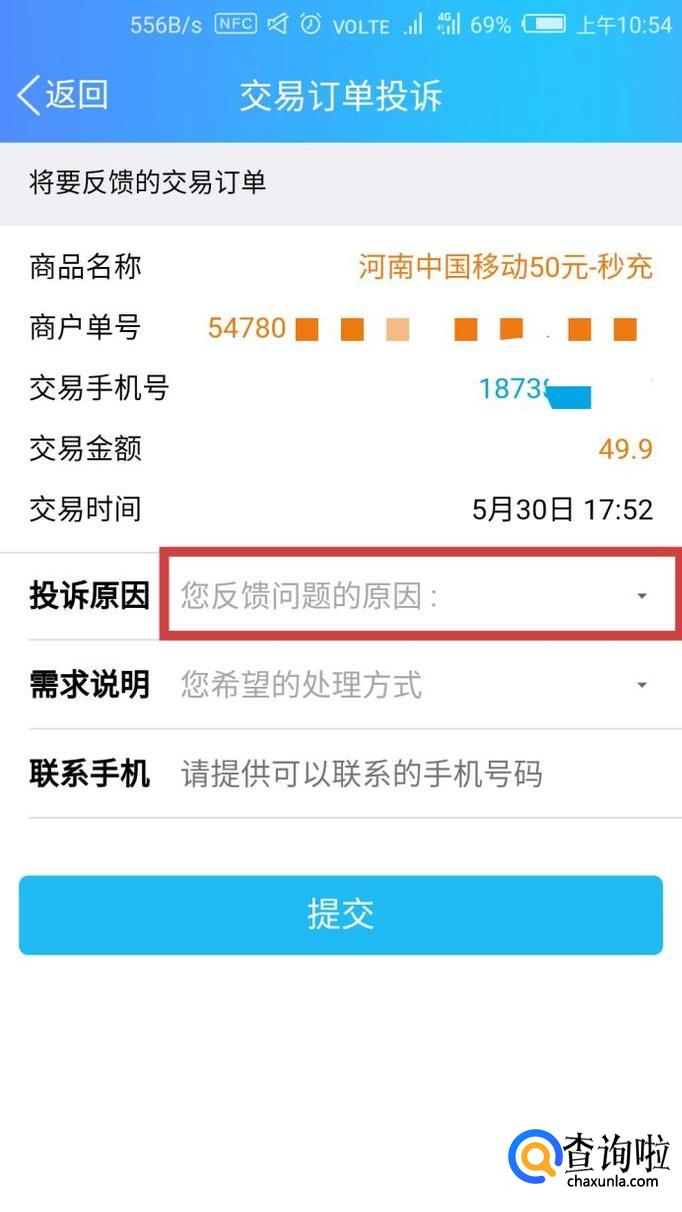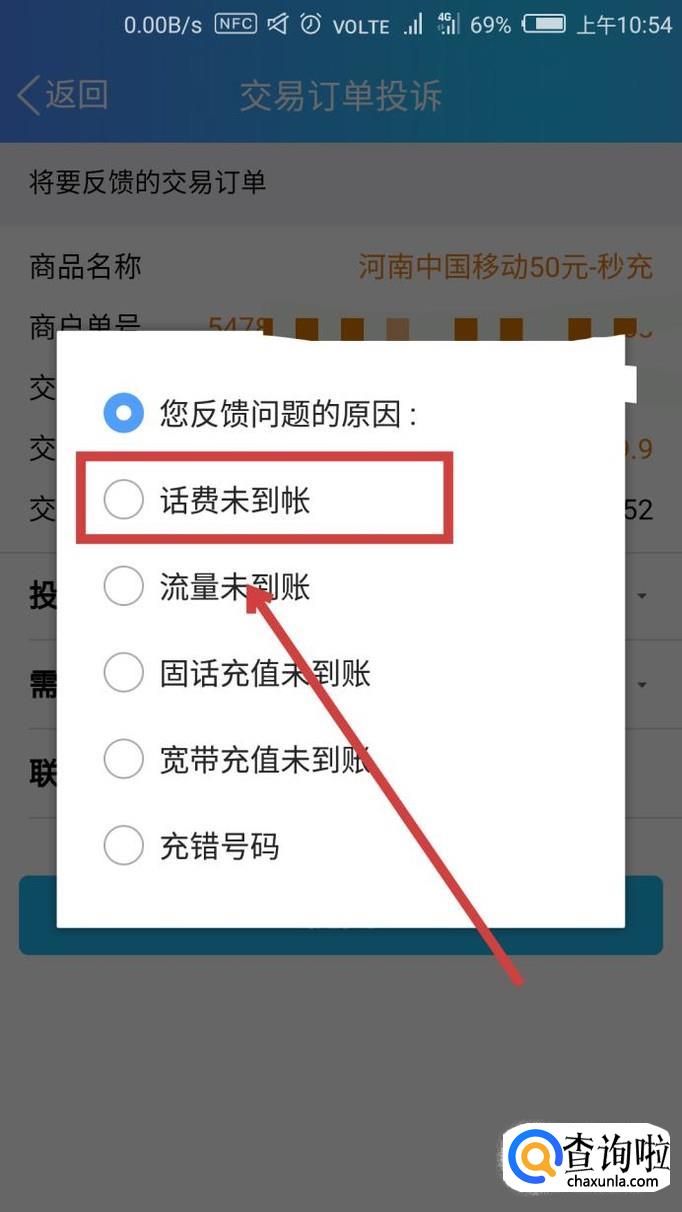 首先点击“投诉原因”,选择“话费未到账”一项,如图所示。