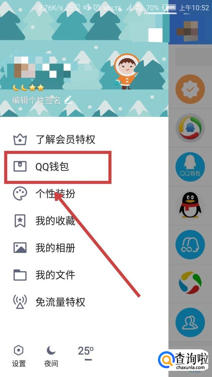 然后在左侧弹出的选项卡中找到“QQ钱包”,点击进入。