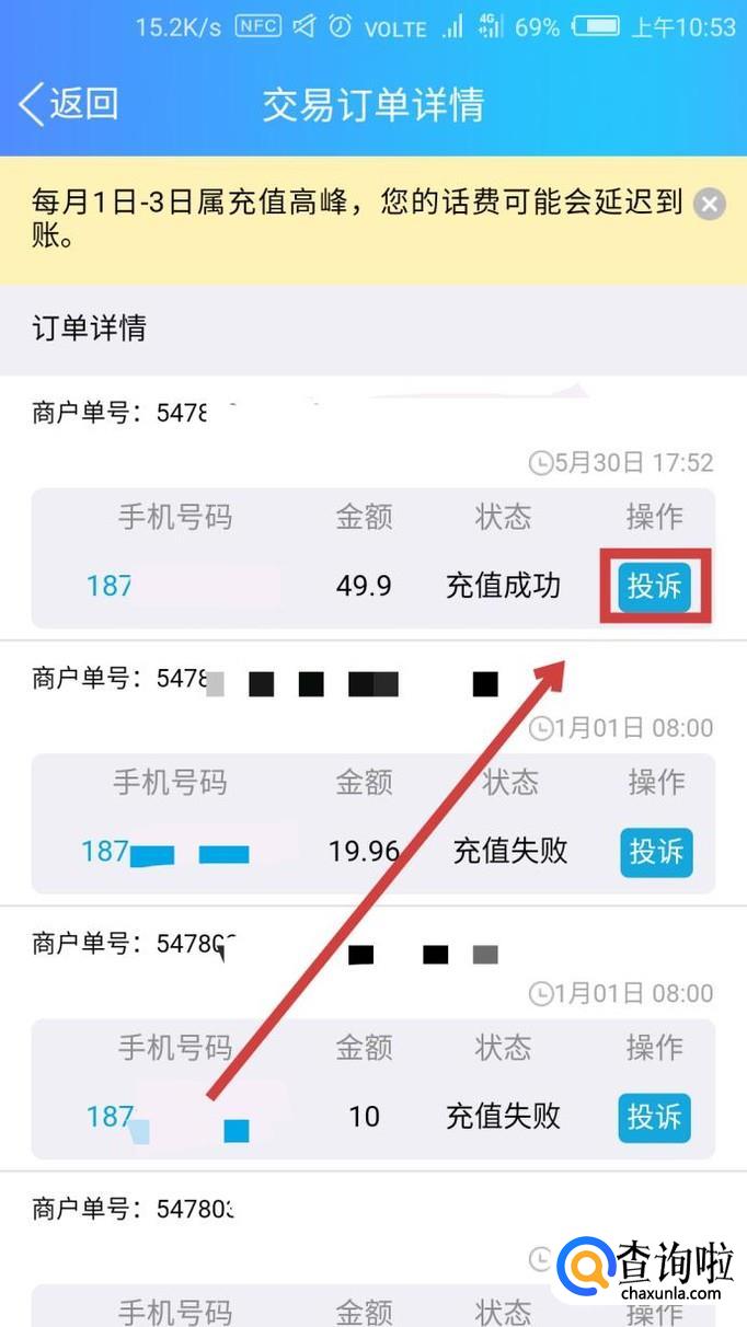 然后找到话费未到账的一项订单,点击右侧的“投诉”,点击进入。