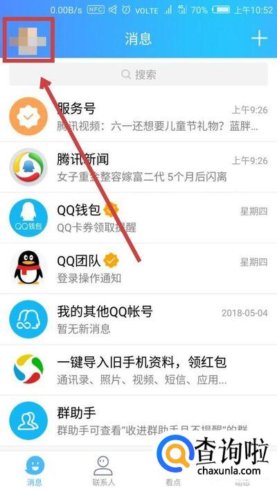 打开QQ,在界面左上角找到你自己的头像,点击进入。
