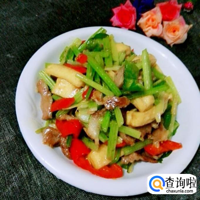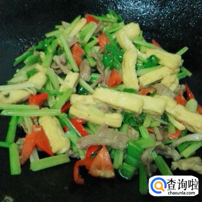 芹菜 250克 豆腐干 250克 猪肉 200克 青红椒 各二个 大蒜籽 二瓣 蚝油 一勺 生粉一勺