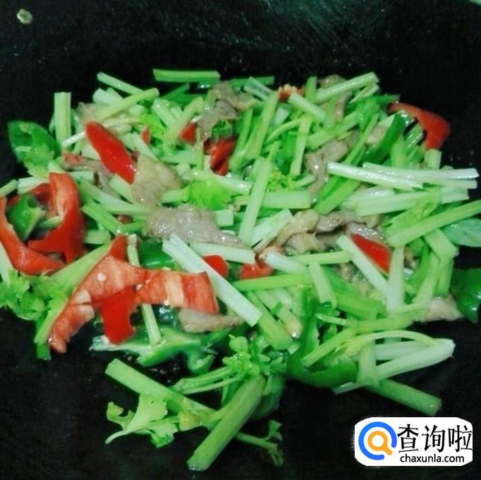 把芹菜段和青红辣椒放下去大火炒二分钟。