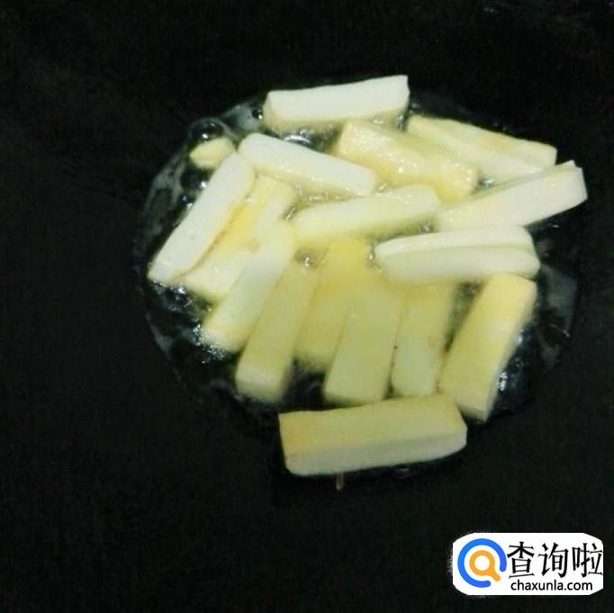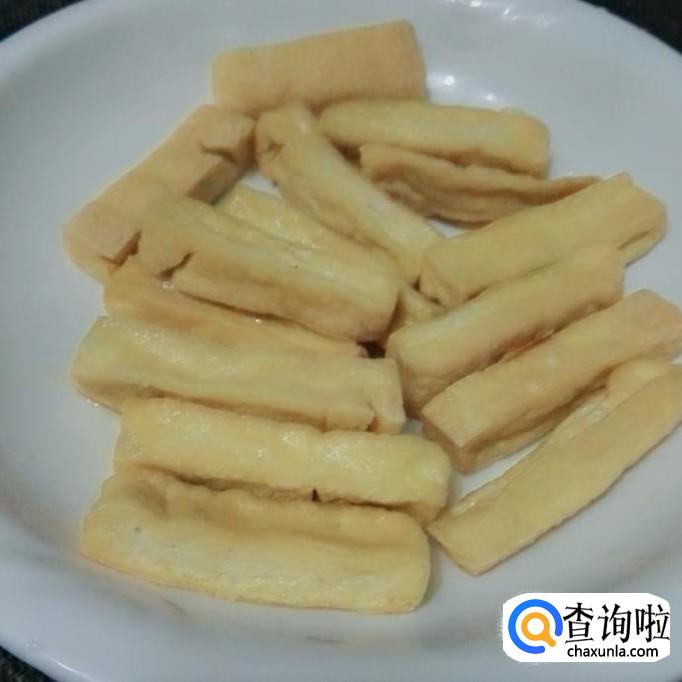 锅烧七成热,放适量花生油,先把豆腐干煎成金黄色,再铲出来放在盘子里备用。