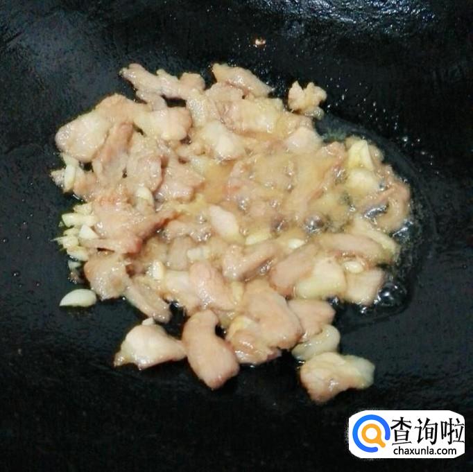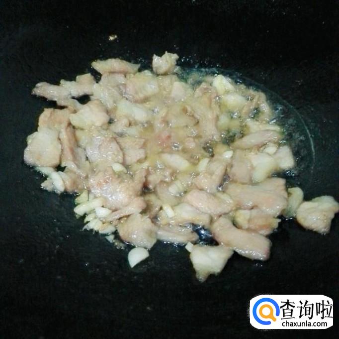 另起锅,放少量花生油,先把大蒜放下去煸出香味,再把猪肉放下去开大火炒熟。