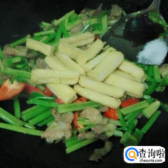 接着把豆干放下去炒均匀,最后放一勺盐,炒均匀即可。