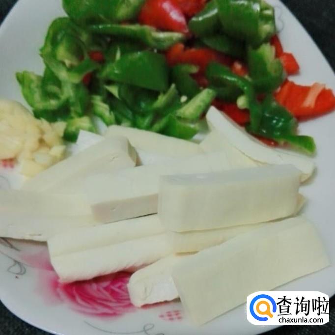 把豆腐干切成条,青红辣椒去籽切成片大蒜籽去皮切碎。