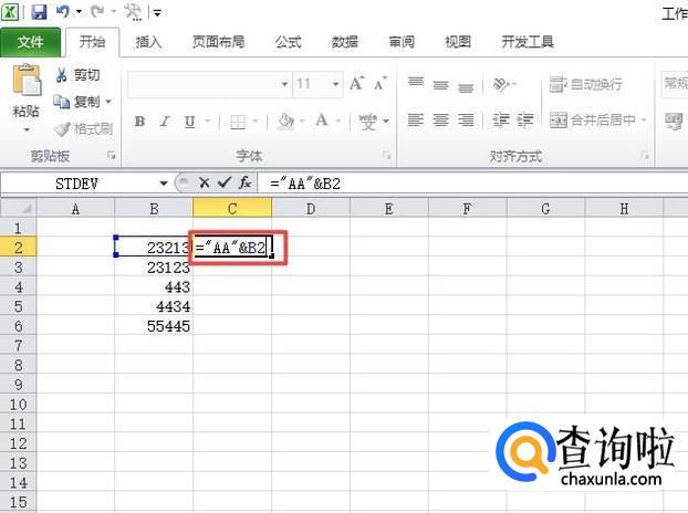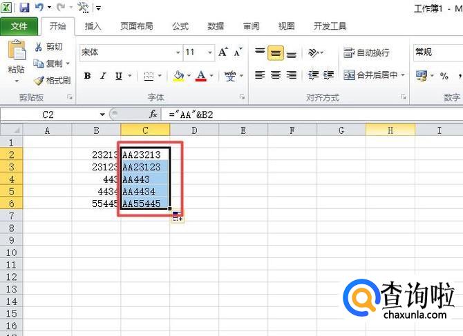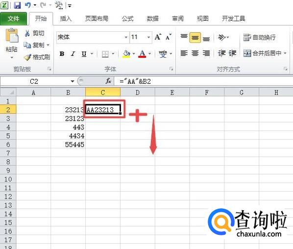 之后我们在第一个数字后面的单元格中输入="AA"&B2,然后我们按回车键;