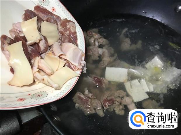 瘦肉清洗干净,切成薄片,加入少许料酒,腌制一会。豆腐清洗干净,切成小块。