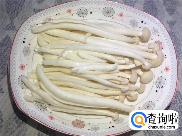 海鲜菇去掉黑色的根部,清洗干净,把大的海鲜菇丝成两半,沥干水分,备用。