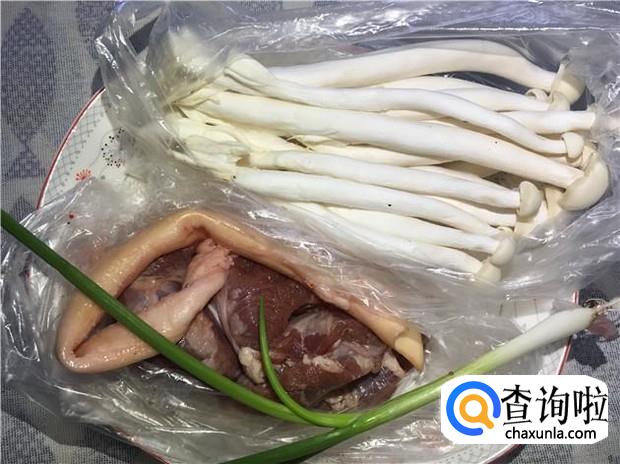 准备好做汤的食材:瘦肉适量、海鲜菇适量、豆腐适量、姜一块、葱一根。