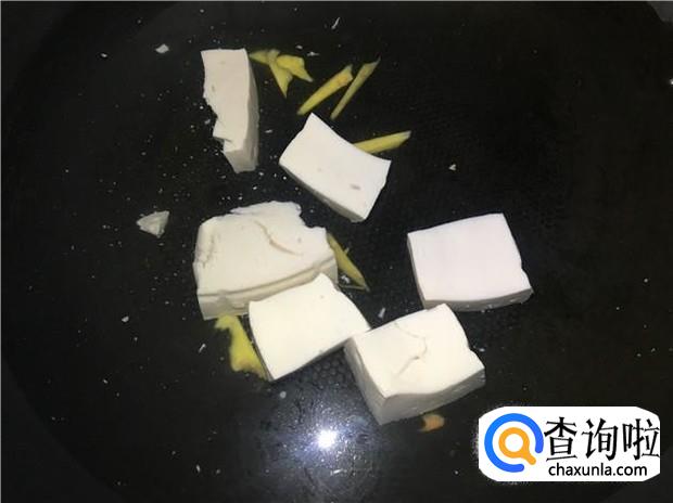老姜清洗干净,切成姜片。热锅下油,放入姜片煸香,然后倒入豆腐丁,再加入适量的清水,大火煮开。豆腐要提前煮熟,因为不熟的豆腐,吃了很容易拉肚子哦。