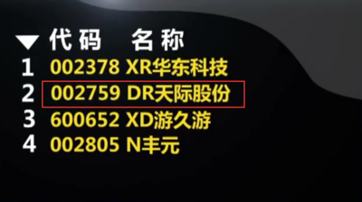 3、当股票名称前出现XR的字样时,表明当日是这只股票的除权日。XR这是英文Exclude Right的缩写,即除权,除权当日股票名称前附加'XR',股价将因股数增加而被摊低。