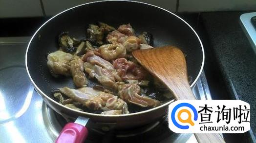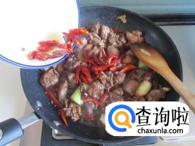 锅中加油,油8分热时加入兔肉,爆炒2分钟,至其变色,且有香味。