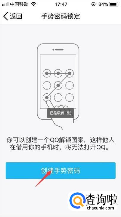 最后我们只要创建手势密码即可,那么每次打开qq都需要使用密码锁。