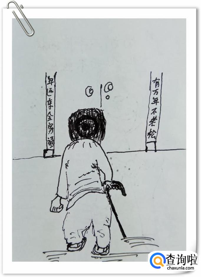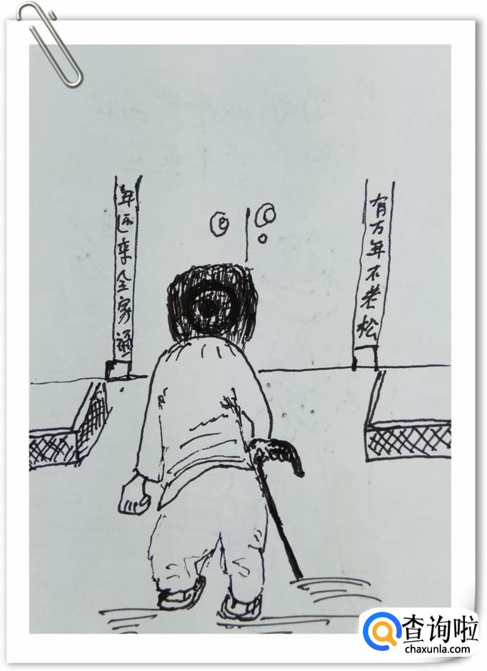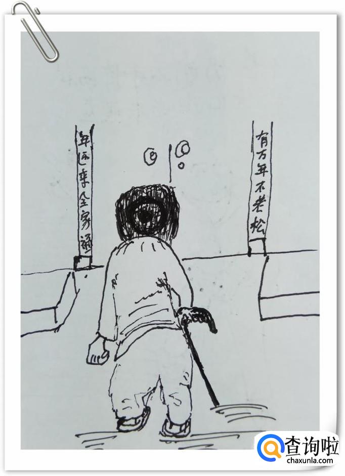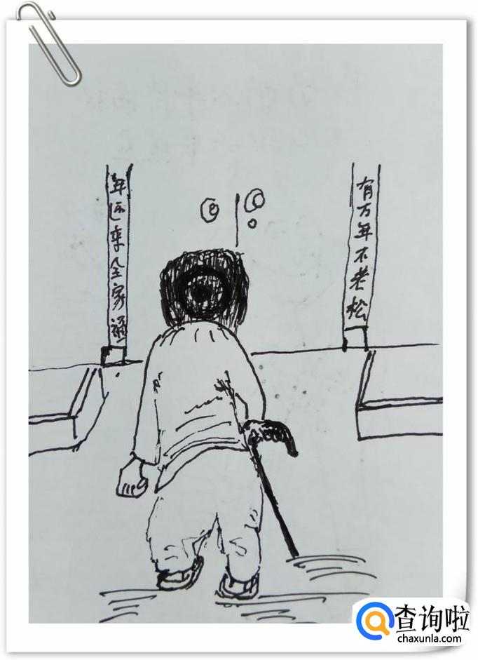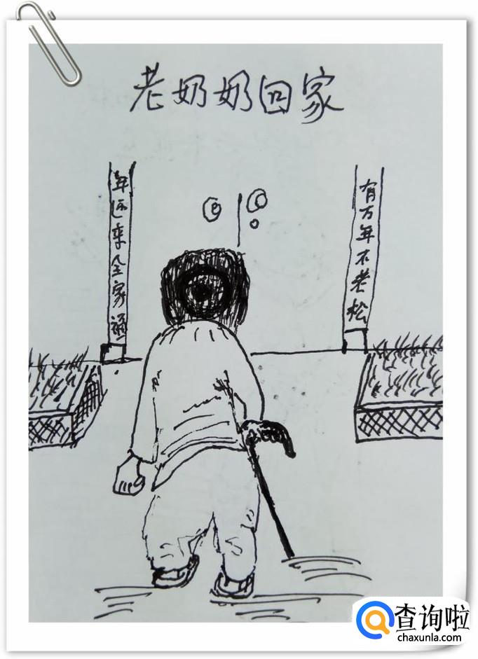 用一下粗线条画出老人头上盘的发髻,再用一些平行线和椭圆形,画出大门,并写出大门两边的对联,这种对开的门,往往是农村的院子,看起来老人生活还是比较殷实的,主要是缺乏精神上的关爱。