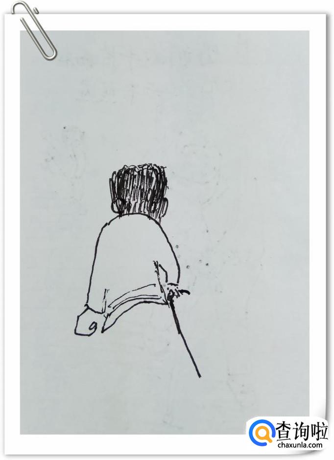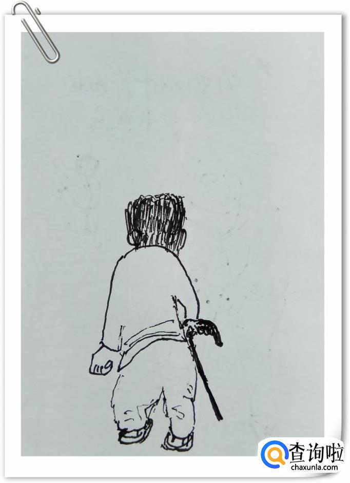 在白纸上用一些弯曲的线条,画出老人的头部,然后再用曲线画出老人的背部和拐杖。这里主要画的是老人的背影,更能显出老人的孤独和寂寞。