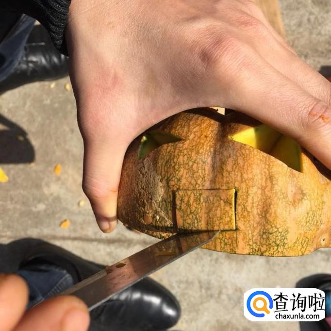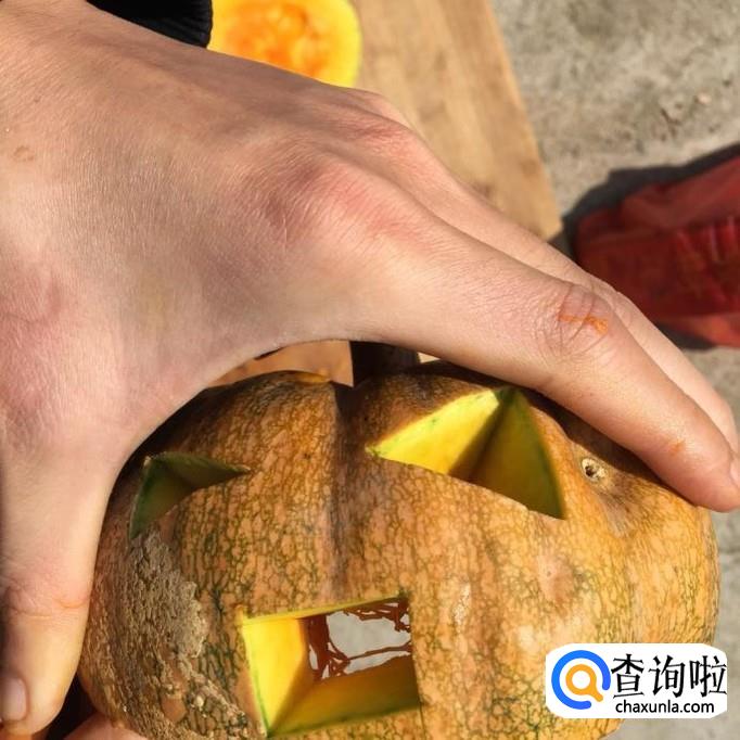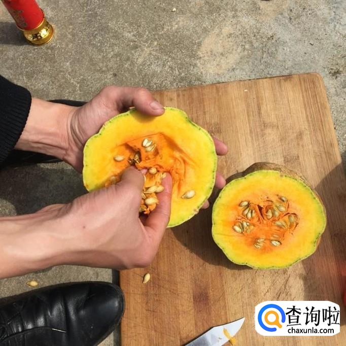 接着把上下两部分的南瓜籽用手掏去。为了让做出来的南瓜灯笼更加轻便,可以选择把部分的南瓜肉用刀切去。
