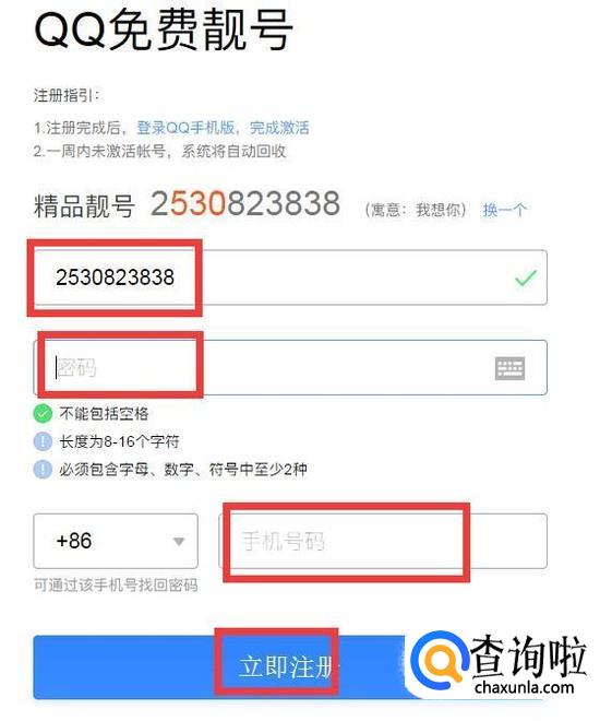 然后复制精品靓号,再输入QQ密码,输入手机号和手机验证码,点击立即注册即可获得一个QQ免费靓号。