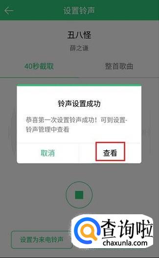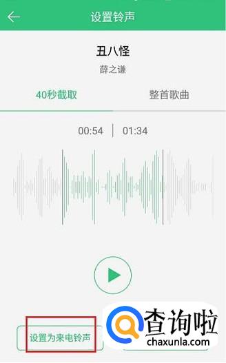 可以选择在整首歌中自由截取40S作为手机铃声,或者也可以选择将整首歌曲作为手机铃声,选择完毕后,点击左下方的“设置为来电铃声”。