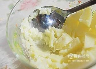 将蒸熟的土豆剥去外皮,放在碗中,用小勺压成泥状,晾凉就可以了。