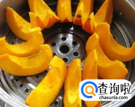 将南瓜挖掉南瓜把儿,切成若干瓣,放入蒸锅中,大火蒸二十分钟。