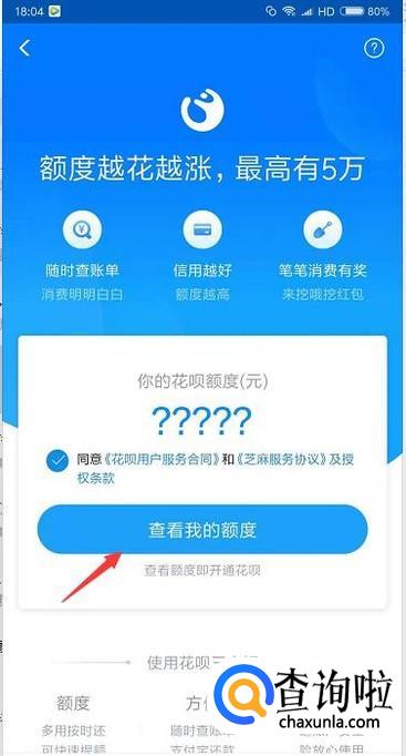 在花呗功能里会提示你查看额度,同意查看即代表同意开通花呗。