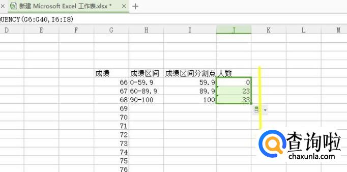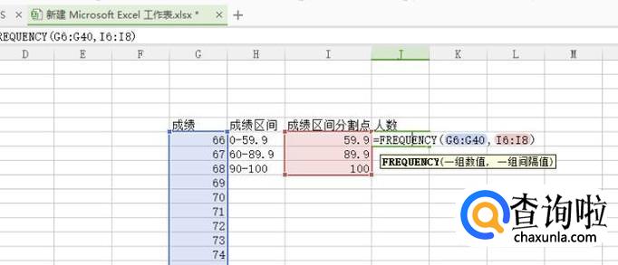 然后选中一个需要统计区间人数的表格输入=FREQUENCY(G6:G40,I6:I8) G6:G40 为所有成绩所在表格,I6:I8为成绩区间分割点所在表格