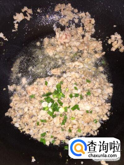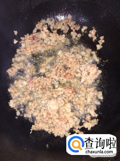 开火,锅里加入适量的食用油,待油温升高后,将肉末下入锅里,翻炒至肉色变白;