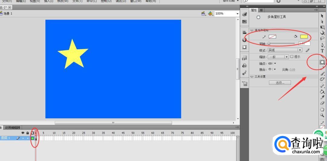 接着在第一帧处,使用星形工具在舞台上绘制星星即可,鼠标点在舞台上,然后滑动鼠标即可绘制一个星星。