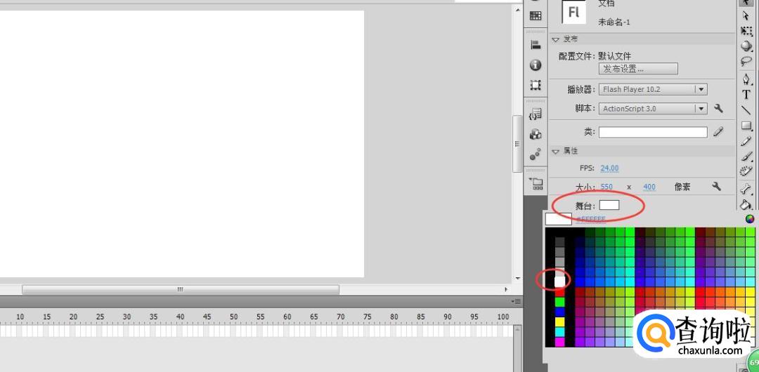 然后可以更改舞台的颜色,点击属性面板下方的“舞台”,然后再选择颜色,默认颜色是白色。