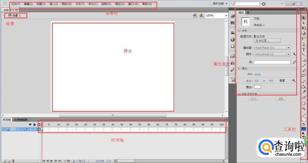 接着可以看到flash的界面区域,包括菜单栏、场景、舞台、时间轴、属性面板和工具栏。