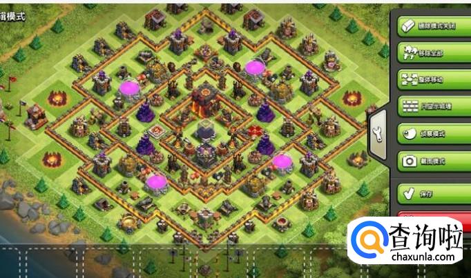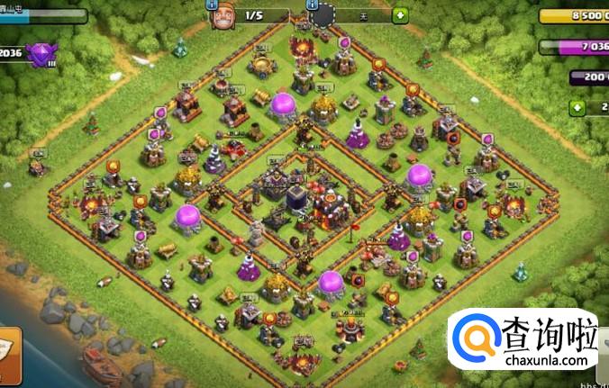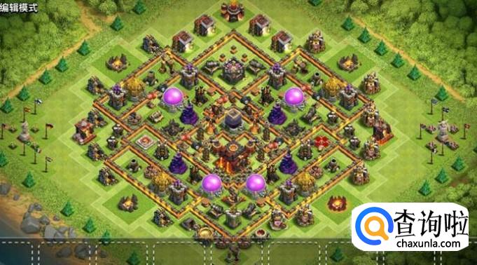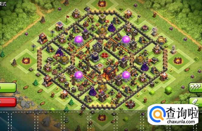 这个阵型是一个护本护资源的阵法,将部落阵营放在中间,当敌人来袭的时候可以快速的支援,然后将圣水放在四个边上,迫击炮的覆盖范围广,加之高血量的围墙,胖子之类基本上无法进入阵法内就已经被打死了,所以说一般人是抢不资源的,其次防空的四个位置也是非常重要的,它们围绕在大本营的周围,可以有效地保护大本营