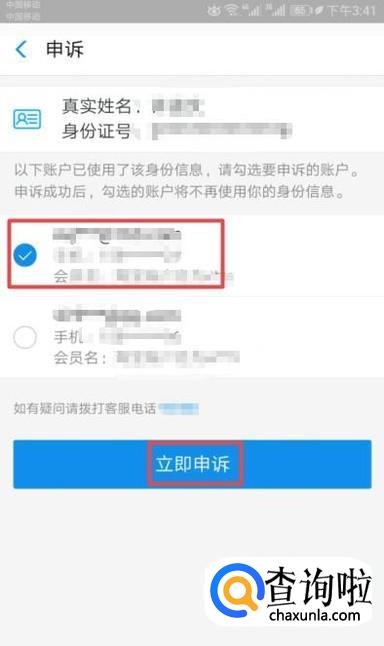 弹出的界面,我们选中我们想要取消关联的账户,之后点击立即申诉就可以了。