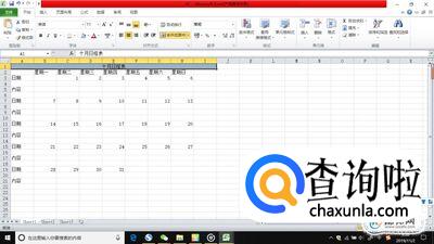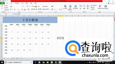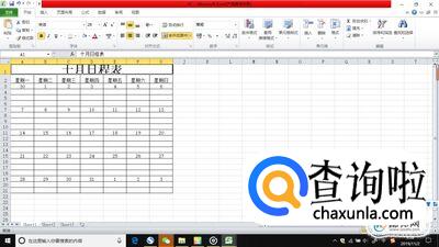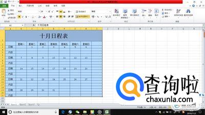 在第一列上写上“10月日程表”,大小就是首列到星期几对应这个月的号数那一列,合并单元格。然后再把一些需要合并的单元格合并并且居中。