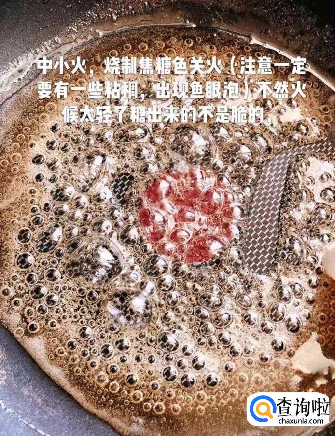 接着开中火熬至焦糖色关火,如下图所示。小贴士:出现鱼眼泡就可以关火了。