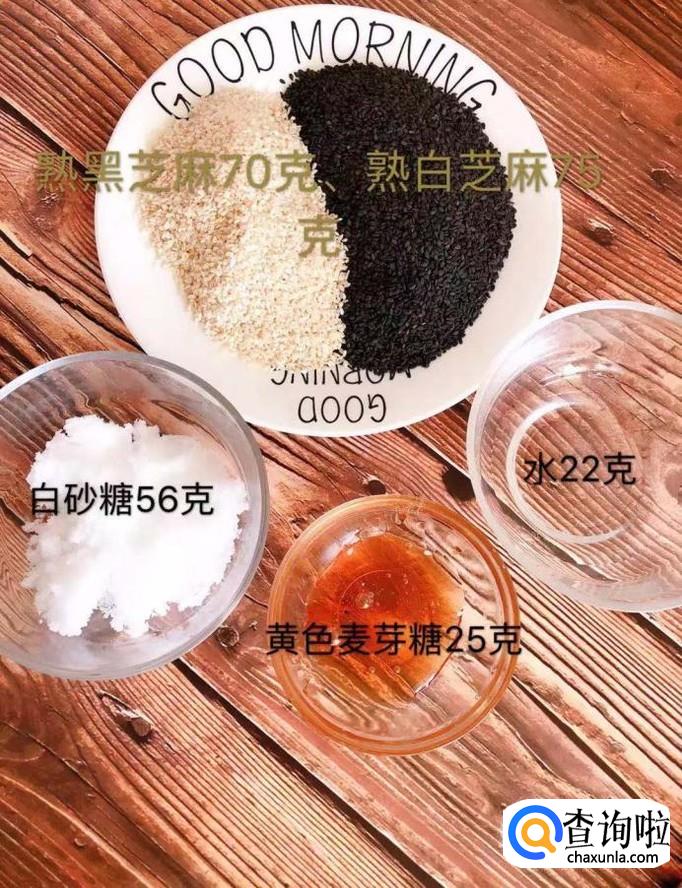 首先准备好所有做芝麻糖的材料,如下图所示。小贴士:熟黑芝麻70克,熟白芝麻75克,白砂糖56克,黄色麦芽糖25克,水22克。