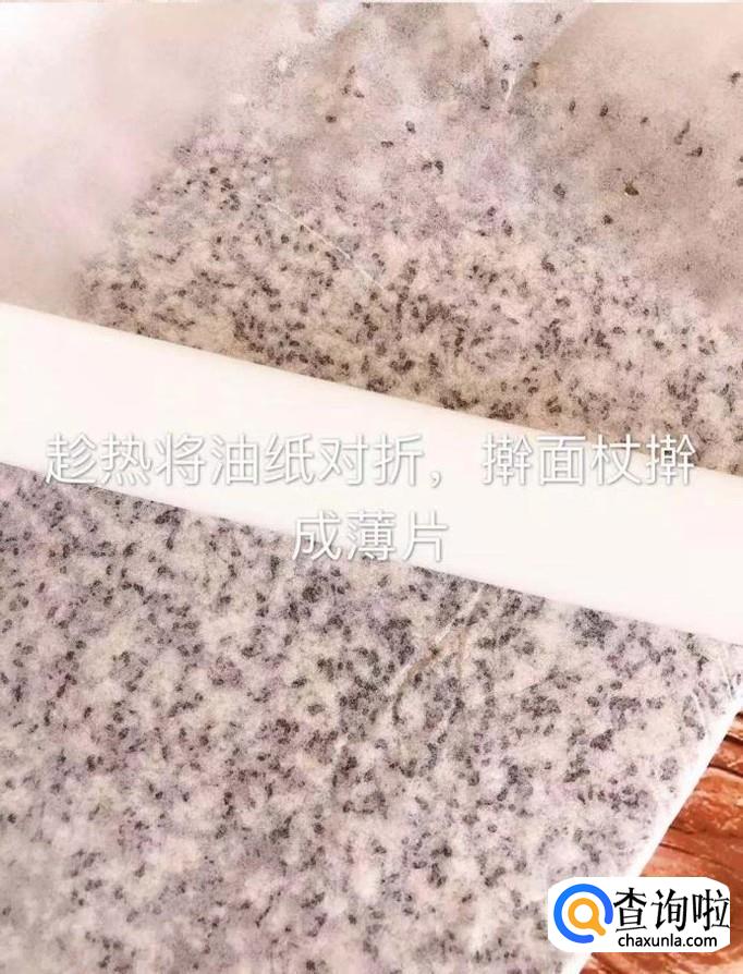 然后把糖放到油纸中对折,用擀面杖擀成薄片,如下图所示。