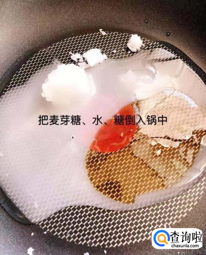 然后把麦芽糖,水和白砂糖倒入锅中,如下图所示。