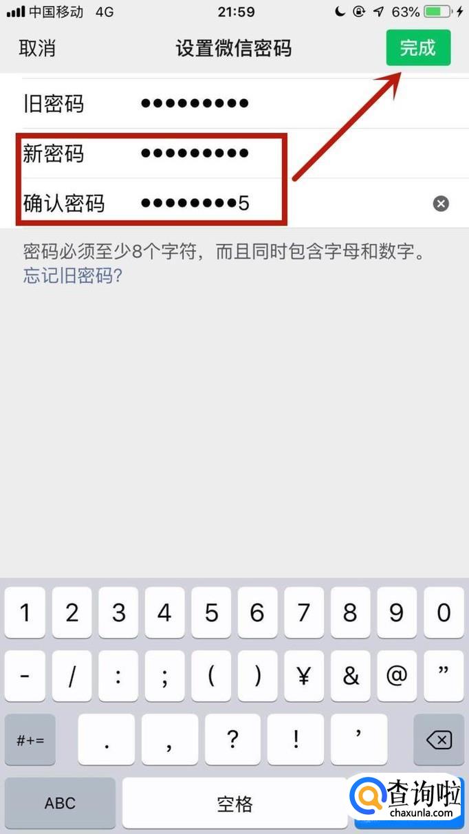 最后连续两次输入新密码并点击完成就可以了。如图所示。
