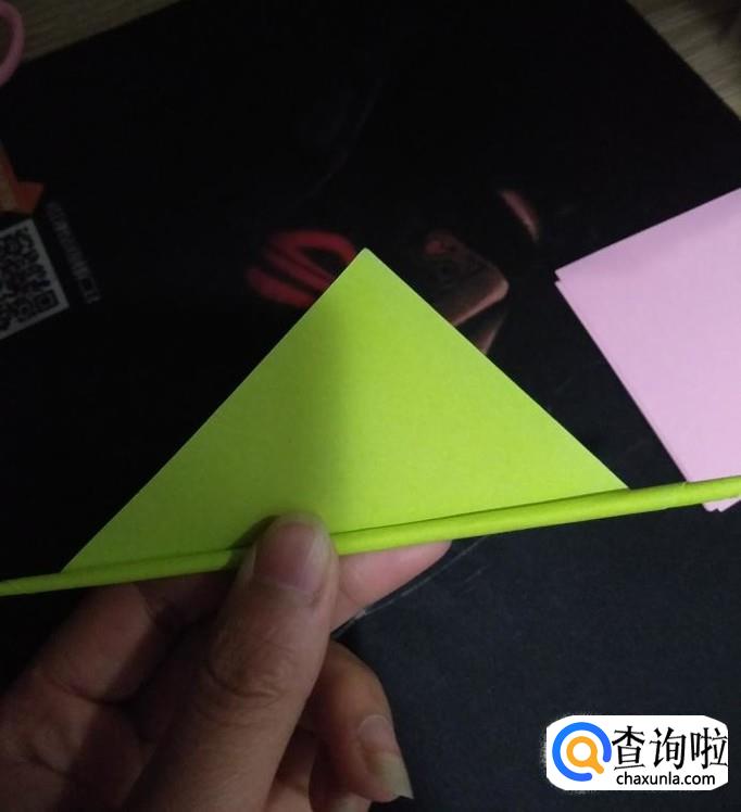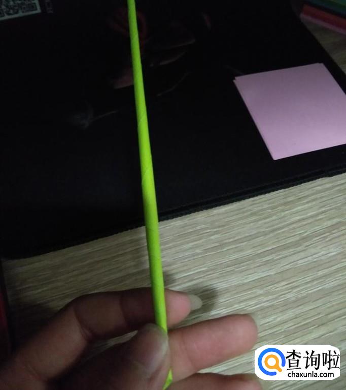 7X7cm的绿色纸裹成一根细棒,如下图所示,末部用胶水粘起来。