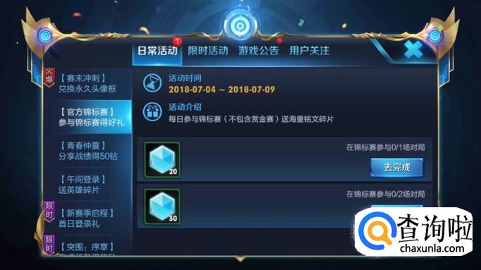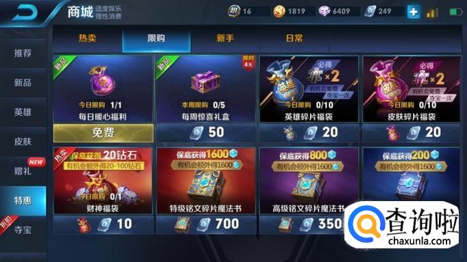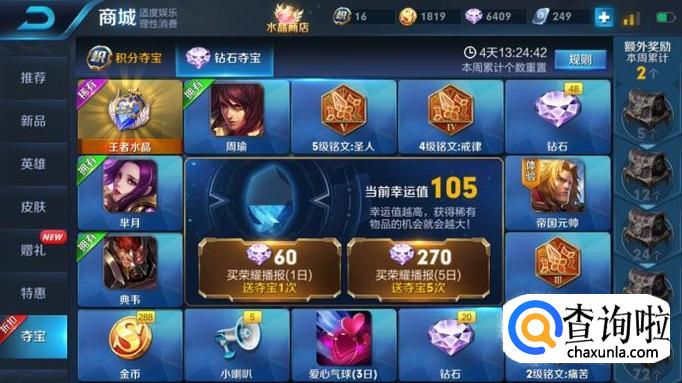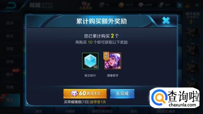 商城夺宝。这个是一个看运气的方式,用钻石或者点券都可以在商城夺宝,区别是钻石夺宝活动的是铭文,而点券夺宝获得的是铭文碎片,注意,每个周夺宝到了一定次数,右边的宝箱会打开,打开宝箱有钻石,铭文碎片,皮肤体验卡等奖励,记得领取哦!