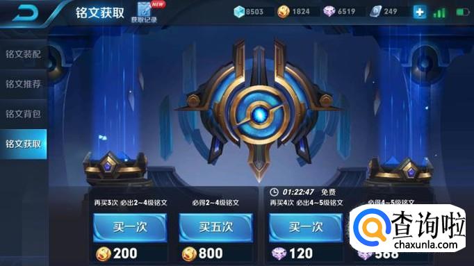 说到铭文,其实大家第一个应该想到的是铭文碎片抽奖,在铭文装备页面最下方,有一个铭文抽奖,有5连抽和单抽,单抽每隔48小时会有一次免费机会,但是5连抽必得4-5级铭文,我在这里非常不推荐大家使用金币来抽,因为不划算,而且得的铭文一般很差。