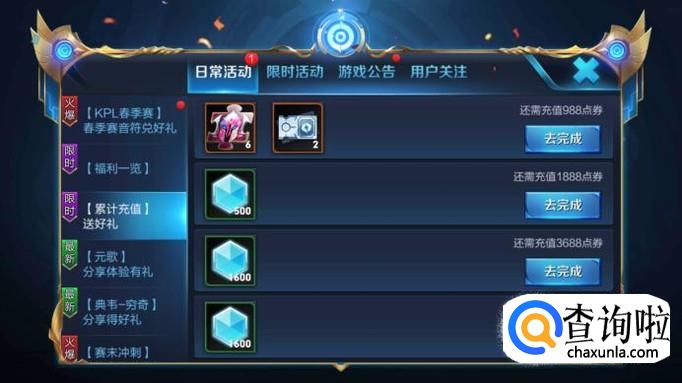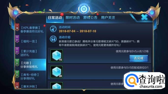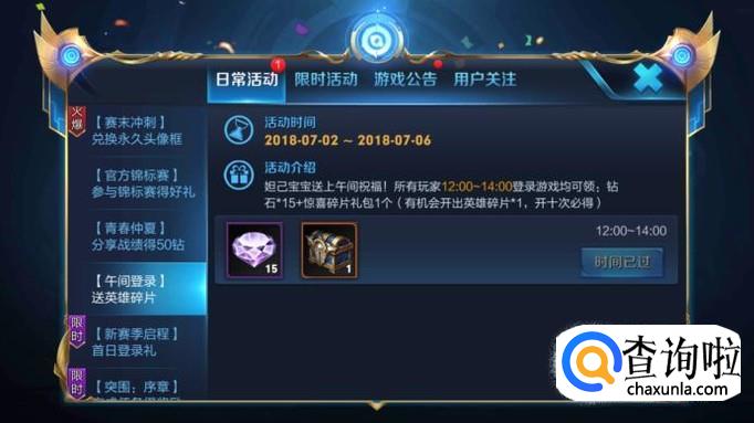 还有就是王者荣耀的日常活动了,王者荣耀为了拉人气会经常性的举办一些福利活动,比如在某一时段(早上或者晚上)登陆游戏,就会活动宝箱,开宝箱有一定几率获得碎片,这个几率一般很高。
