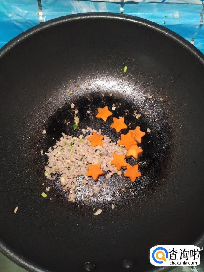 将刻好的胡萝卜五角星倒入锅中,和肉末一起翻炒一下。