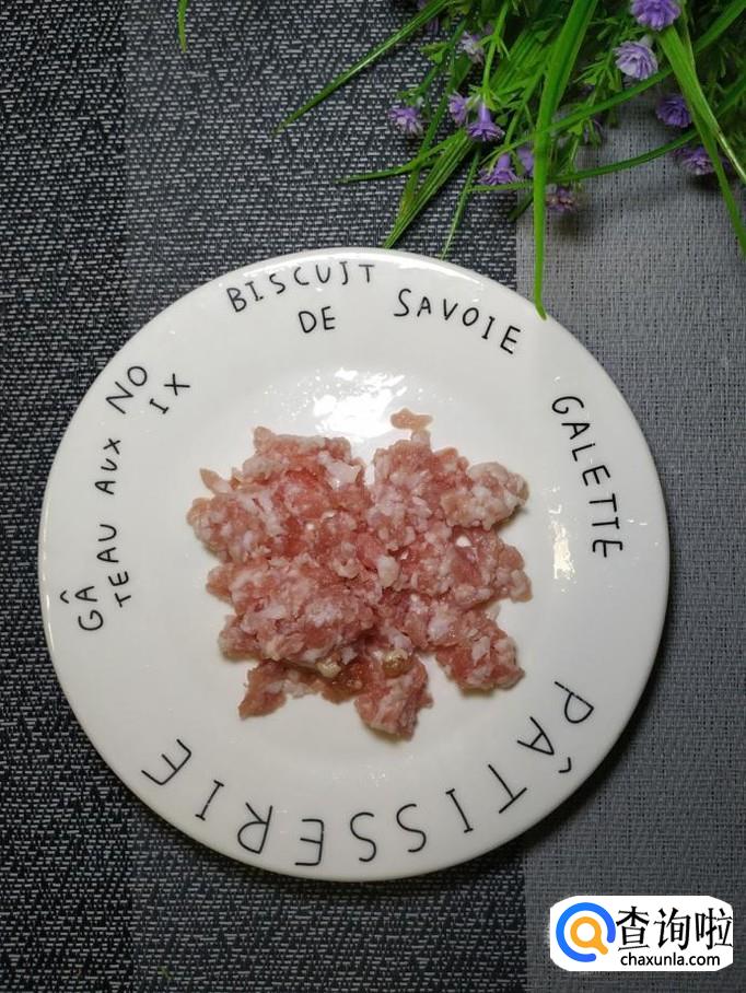 准备适量五花肉,洗净后剁成肉末,备用,然后再准备适量的生姜和小葱,洗净后切碎,放在上面,放上适量盐,鸡精,五香粉,生抽,料酒,淀粉,搅拌均匀,腌制15分钟。