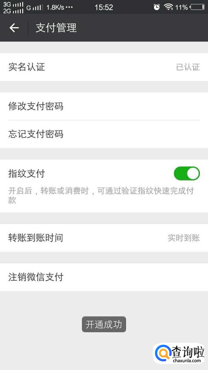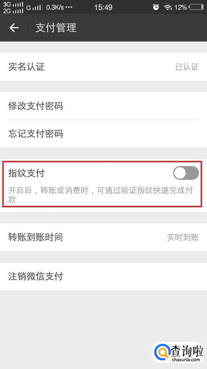 进入后,打开指纹支付,指纹支付后面的图标变为绿色就表示打开了